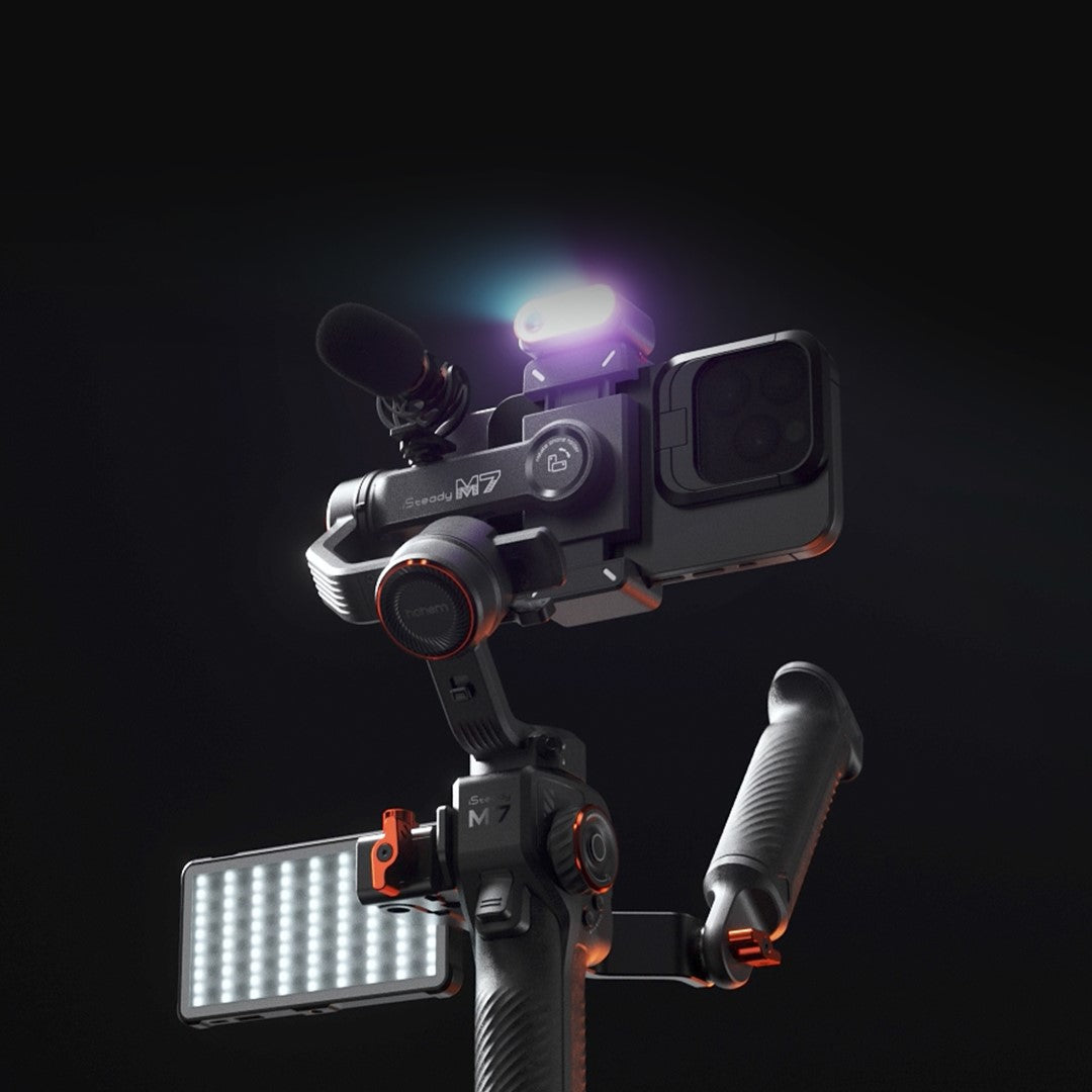Integrated RGB and CCT fill light flexibly illuminates your front and rear shots, and supports seamless control of brightness and color temperature from remote.