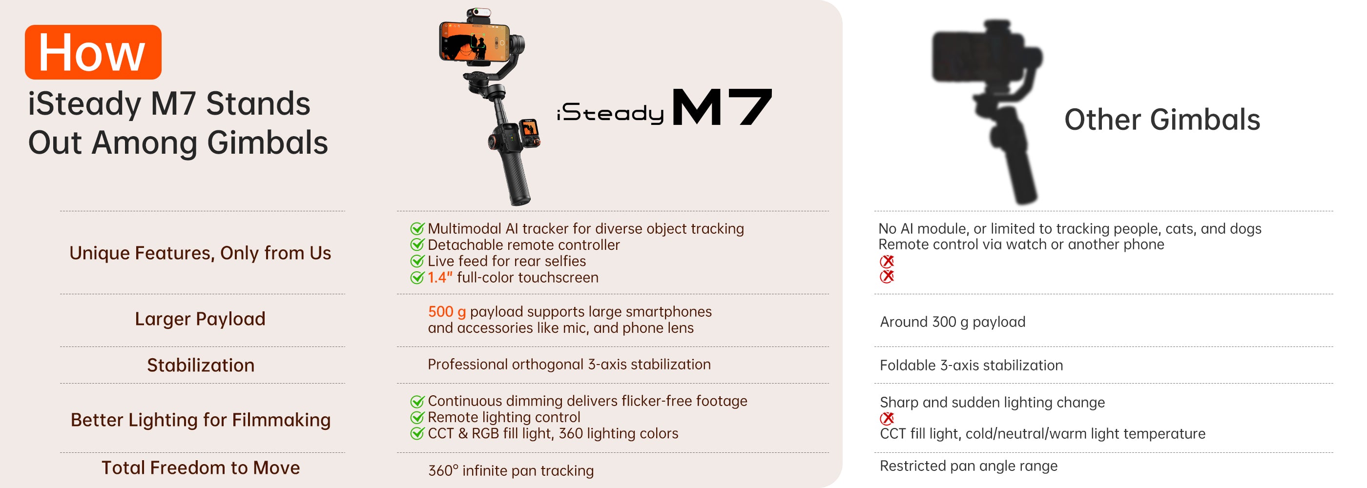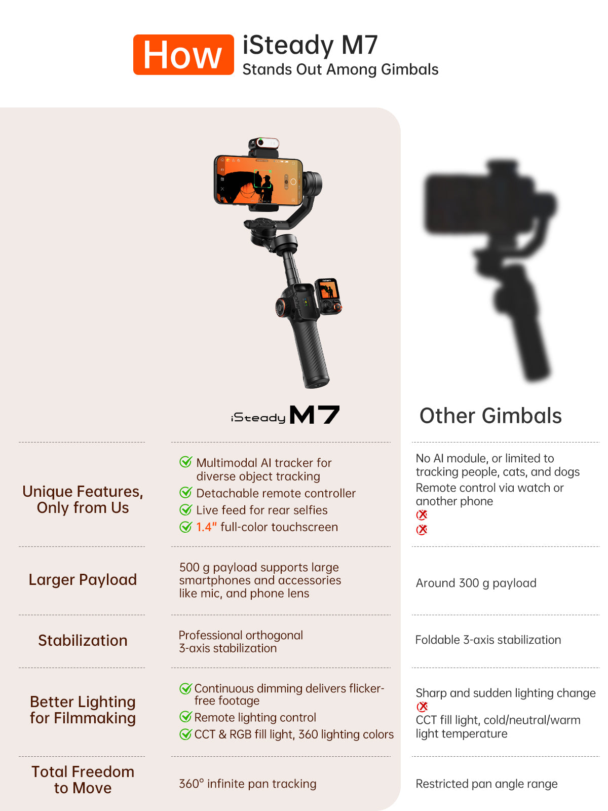 Whether you’re honed in on the local wildlife, your darling pet who just won’t sit still for the camera, or your own face while on a whirlwind adventure, the iSteady M7 can easily keep your preferred subject in the frame for the best shot possible. There’s no need for special apps here, either. The iSteady’s AI-powered tracking can focus on precision—even your pets go running at once!