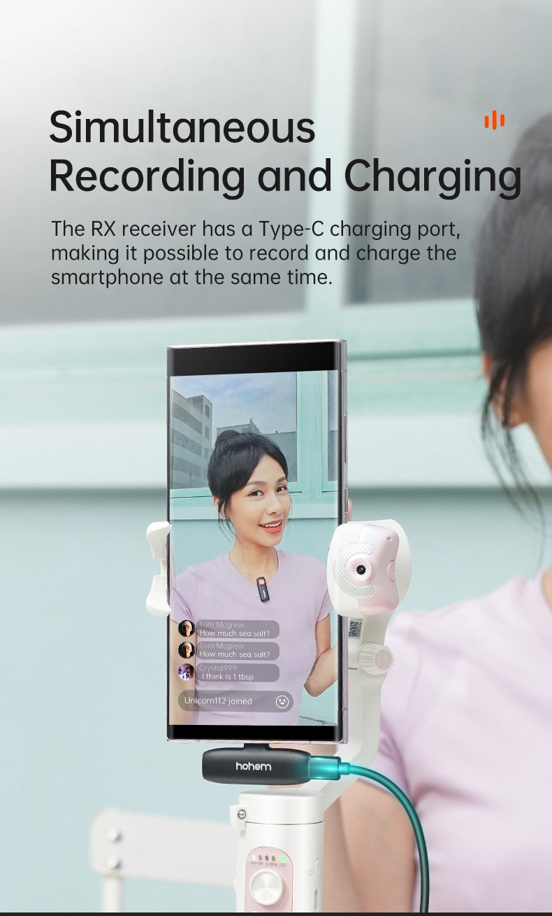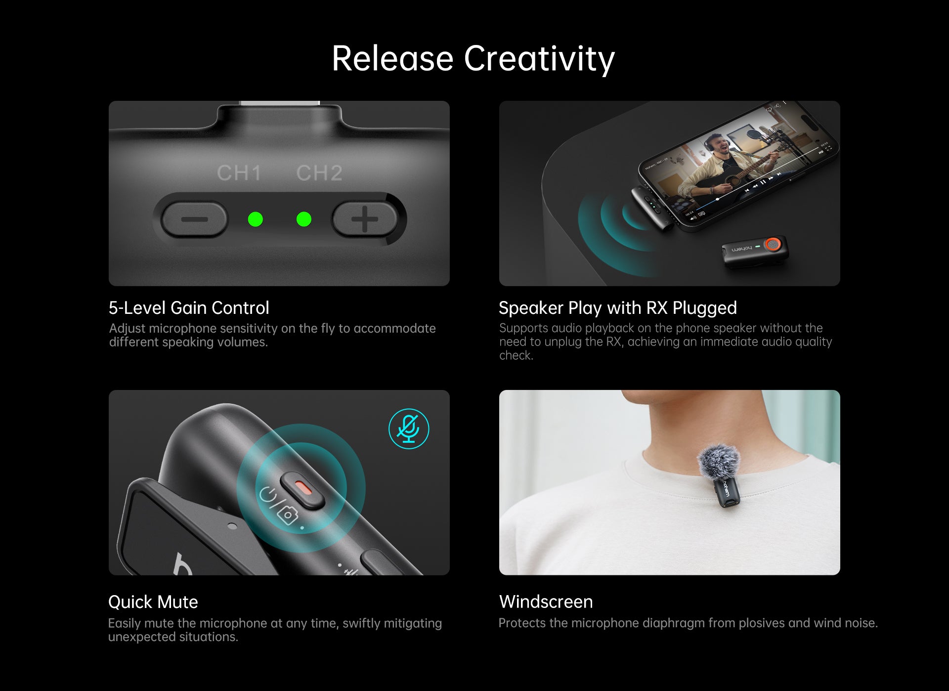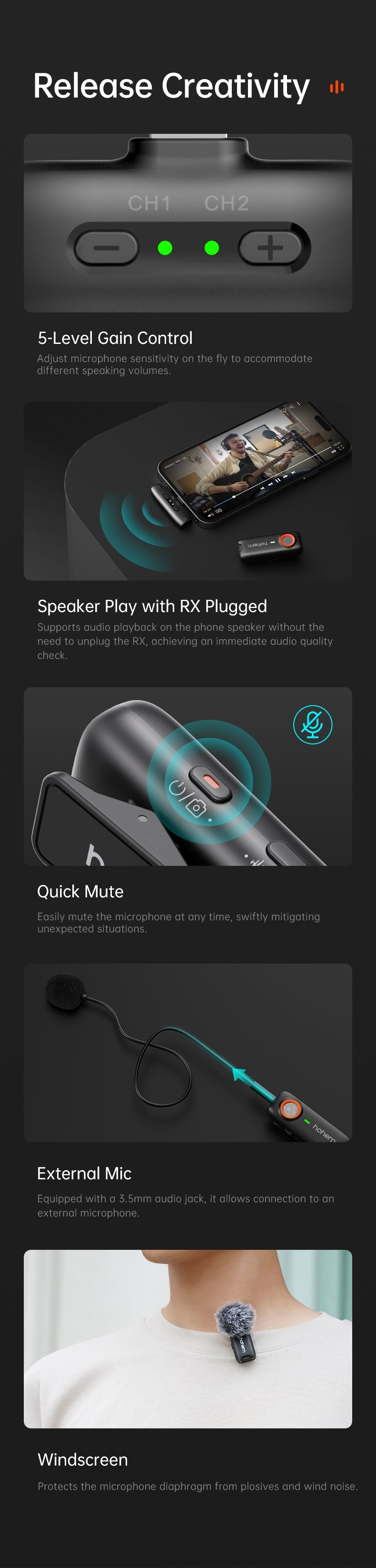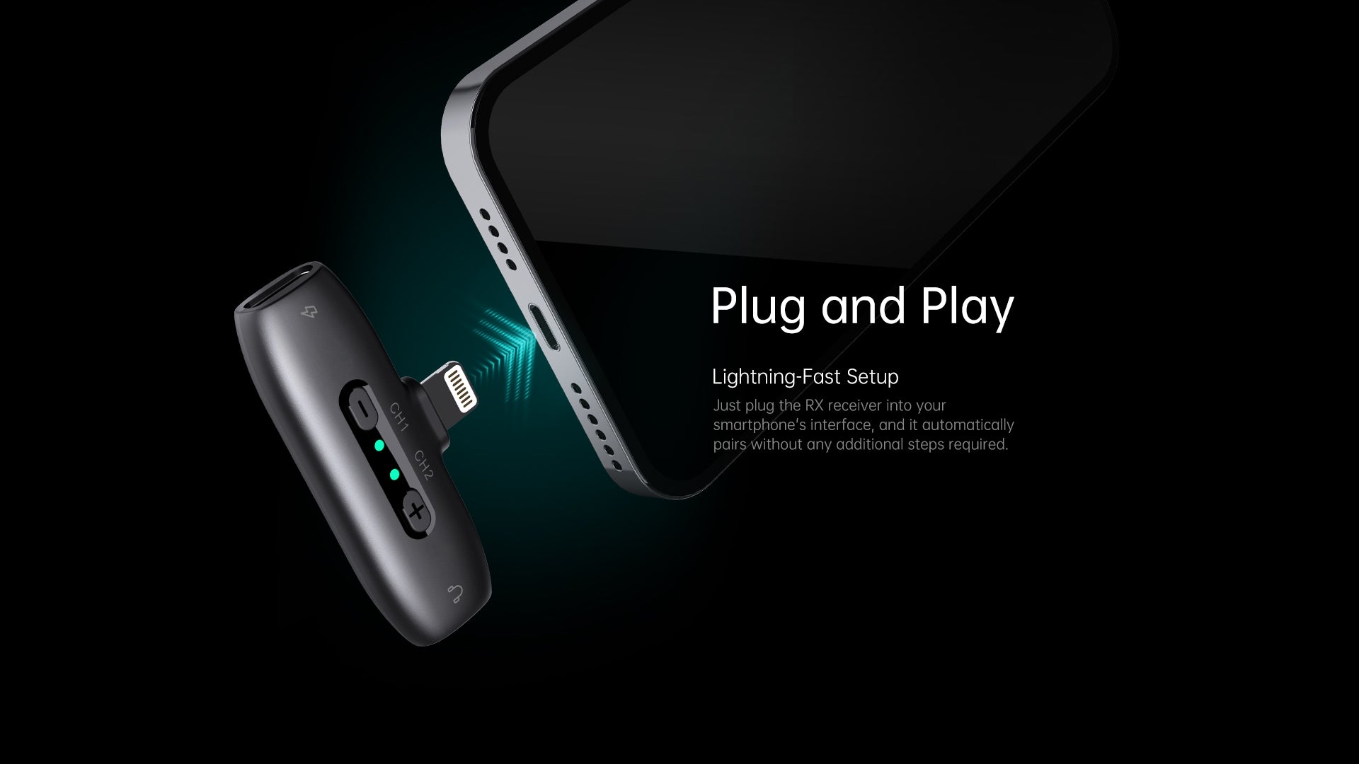 - Simply plug in the RX receiver to commence recording, making it the ideal choice for video creators seeking versatility across multiple devices.