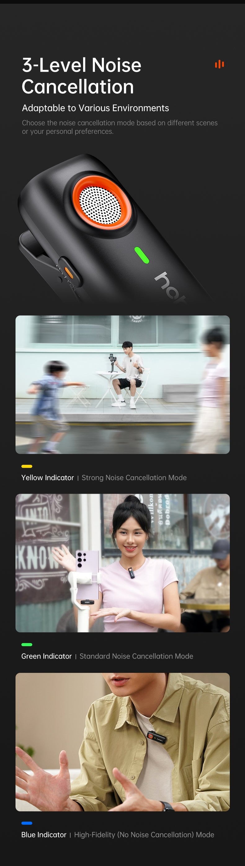 - Choose from three distinct noise cancellation settings, ensuring crystal clear recordings even amidst challenging environments.