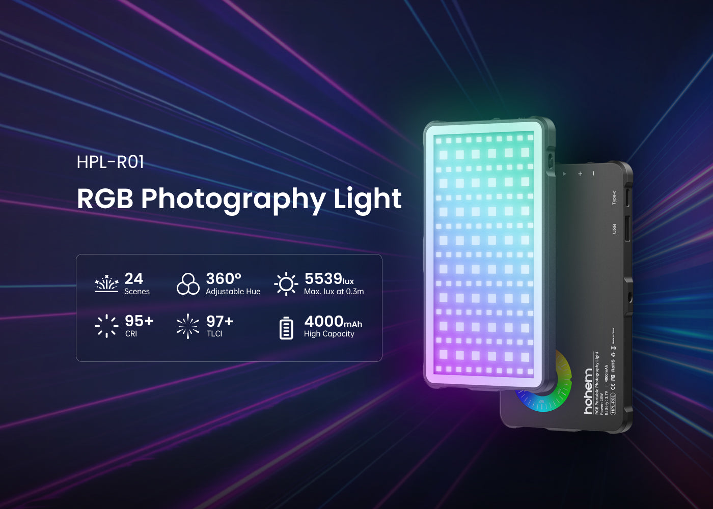 Hohem professional portable RGB full-color LED video light HPL-R01, designed for versatility and creativity. With multiple modes and up to 16 million color combinations, this light supports full adjustment of hue, brightness, and saturation. It also boasts 24 scene simulation modes for dynamic lighting effects.