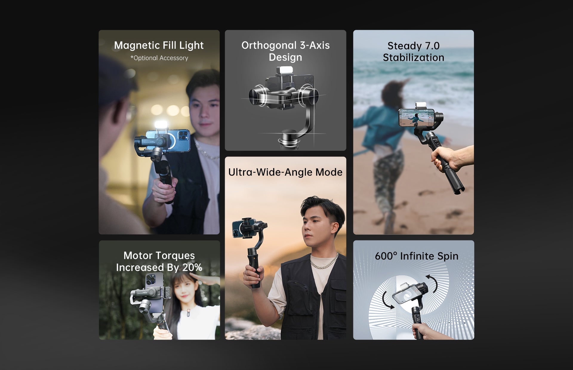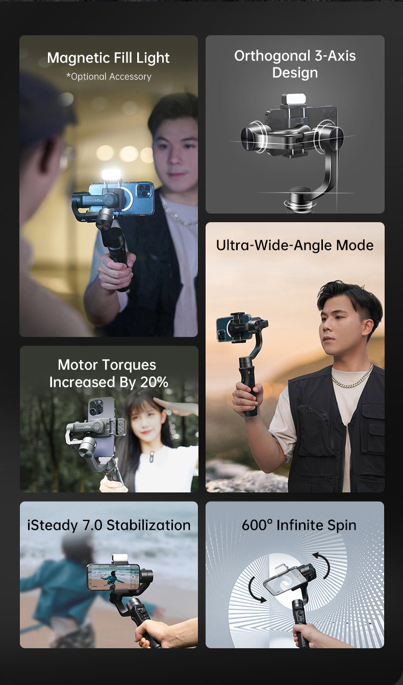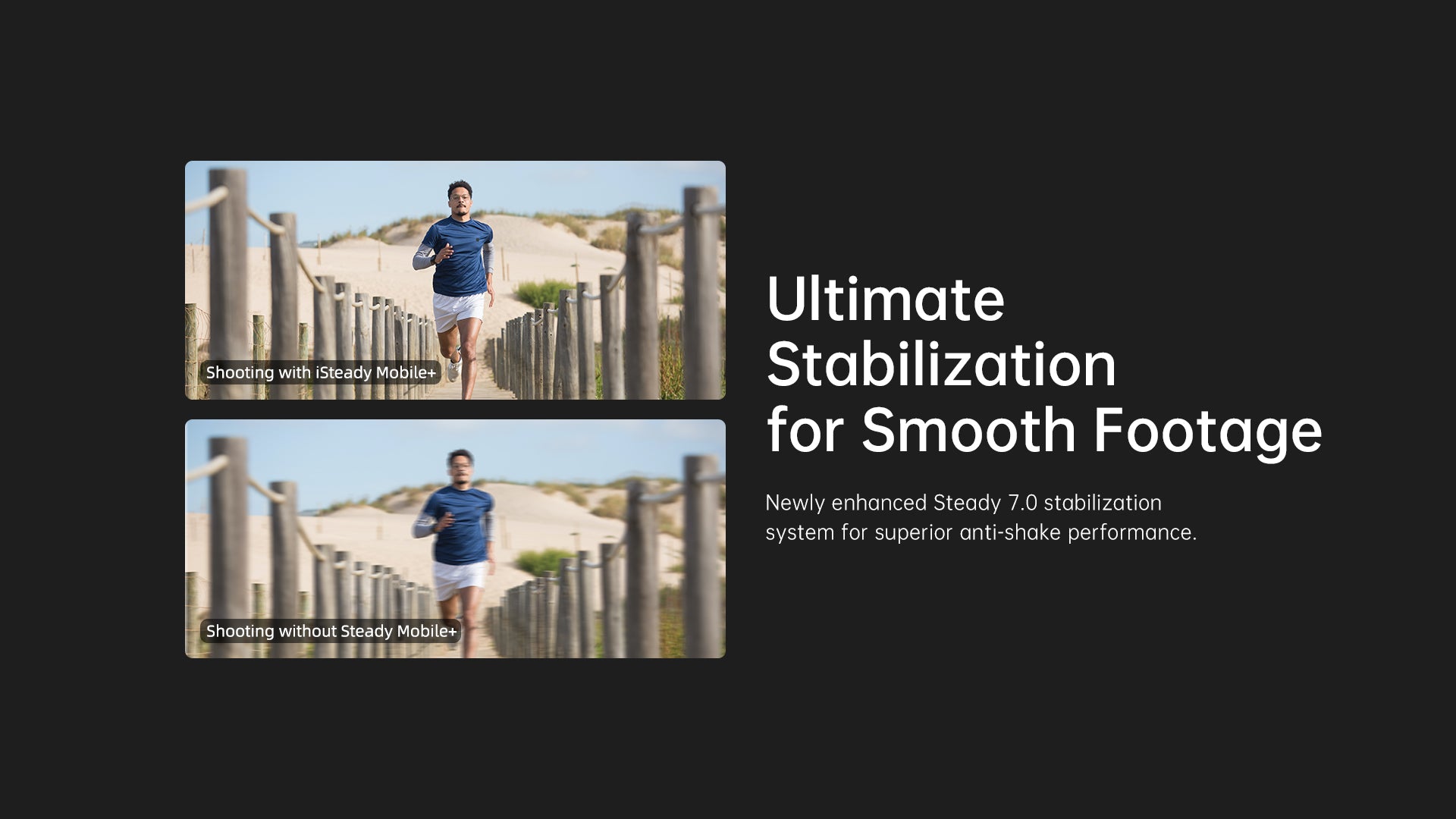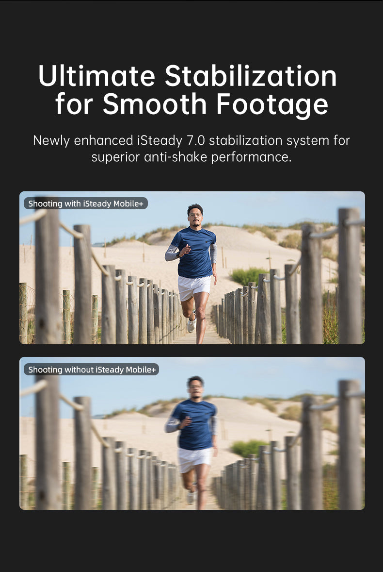 ➤iSteady 7.0 stabilization: Its iSteady 7.0 anti-shake algorithm and orthogonal 3-axis design make it unique in creating ultra-smooth video while allowing movements from all angles.