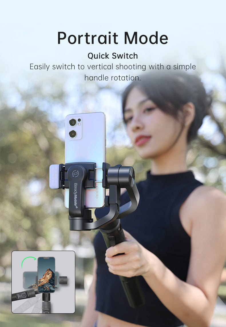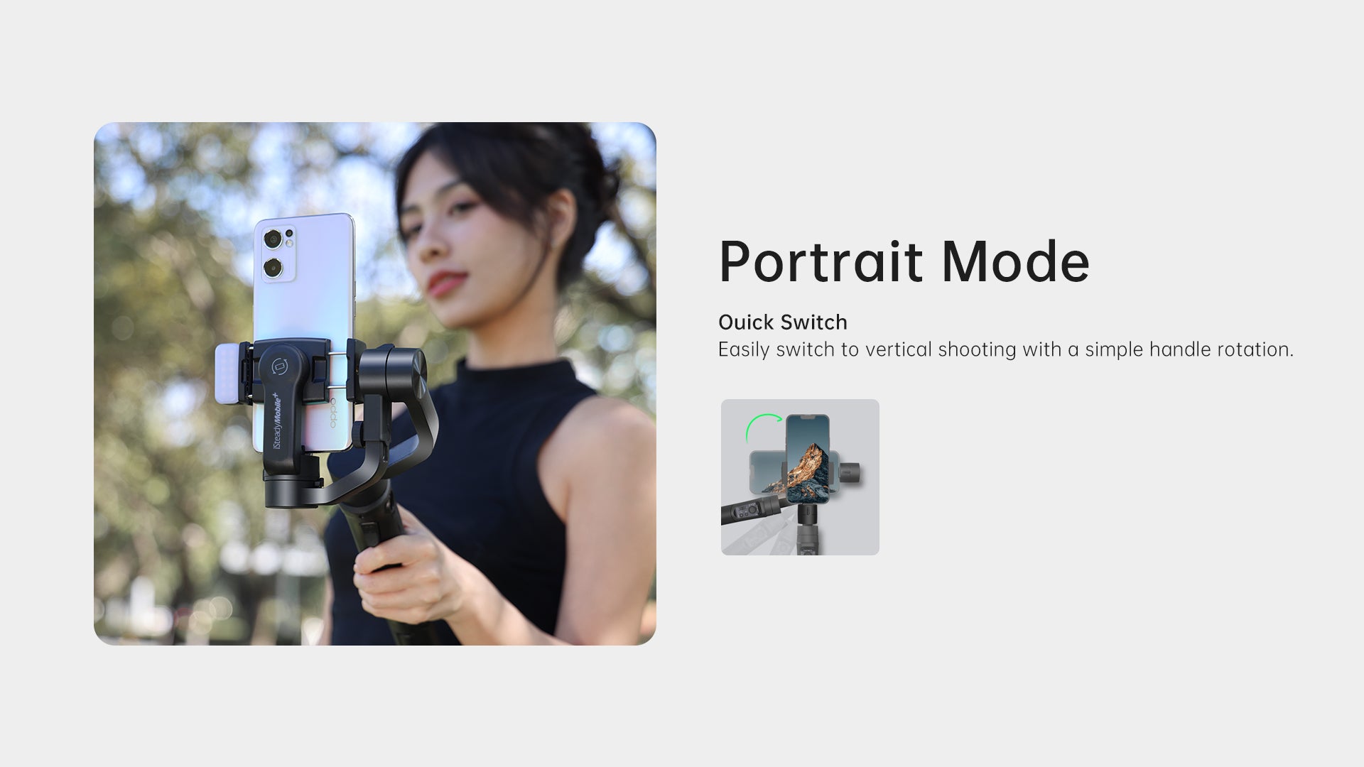 ➤Quick Switch Between Landscape & Portrait Mode: Just manually rotate the roll axis arm while holding the gimbal horizontally.
