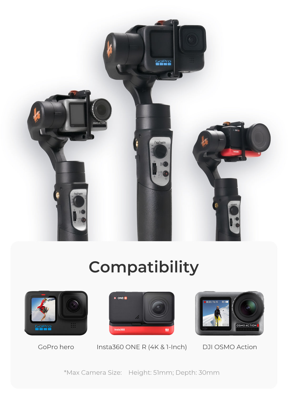 iSteady Pro 4 is compatible with GoPro Hero 5-13, DJI OSMO Action, Insta360 ONE R (4K & 1-Inch), and other action cameras with similar size. Except for the gopro series, Bluetooth control of other sports cameras is not supported for the time being.